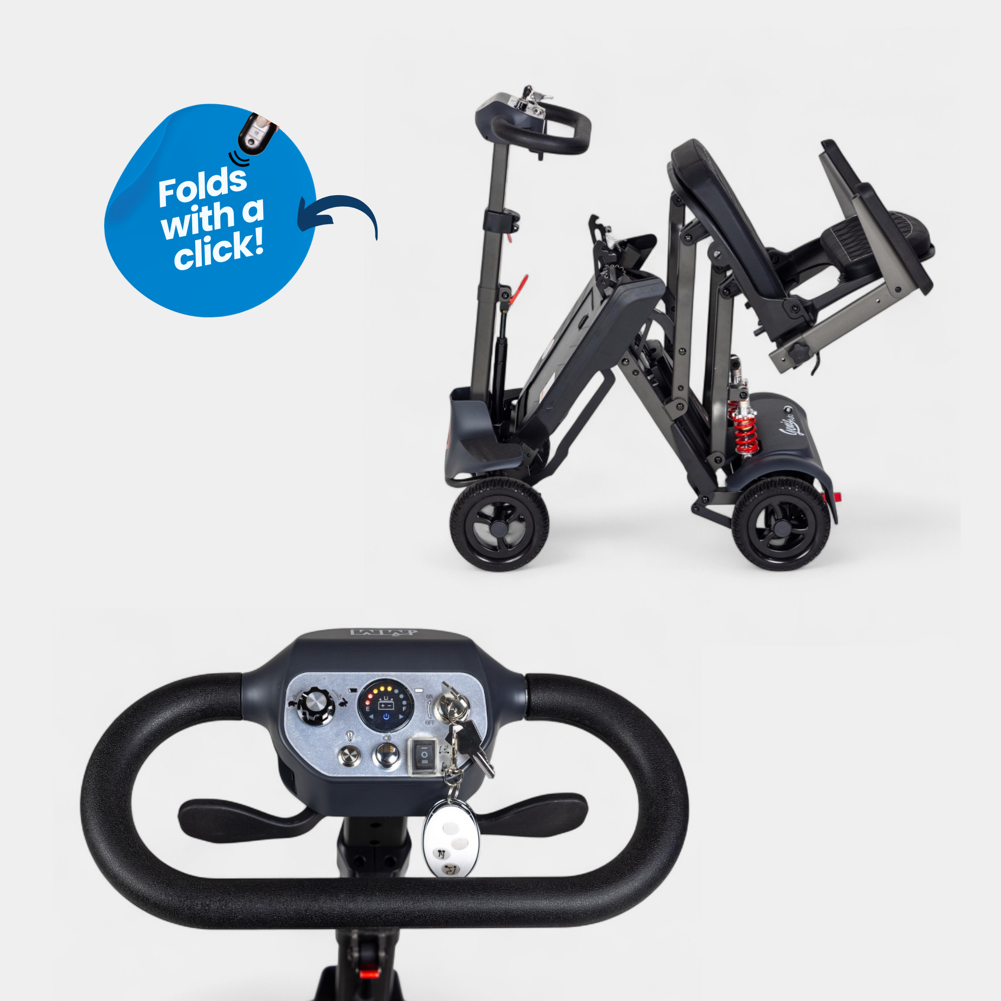 The Monarch Genie Auto is a lightweight, travel-friendly mobility scooter with a remote-controlled automatic folding system – folding in seconds at the push of a button.